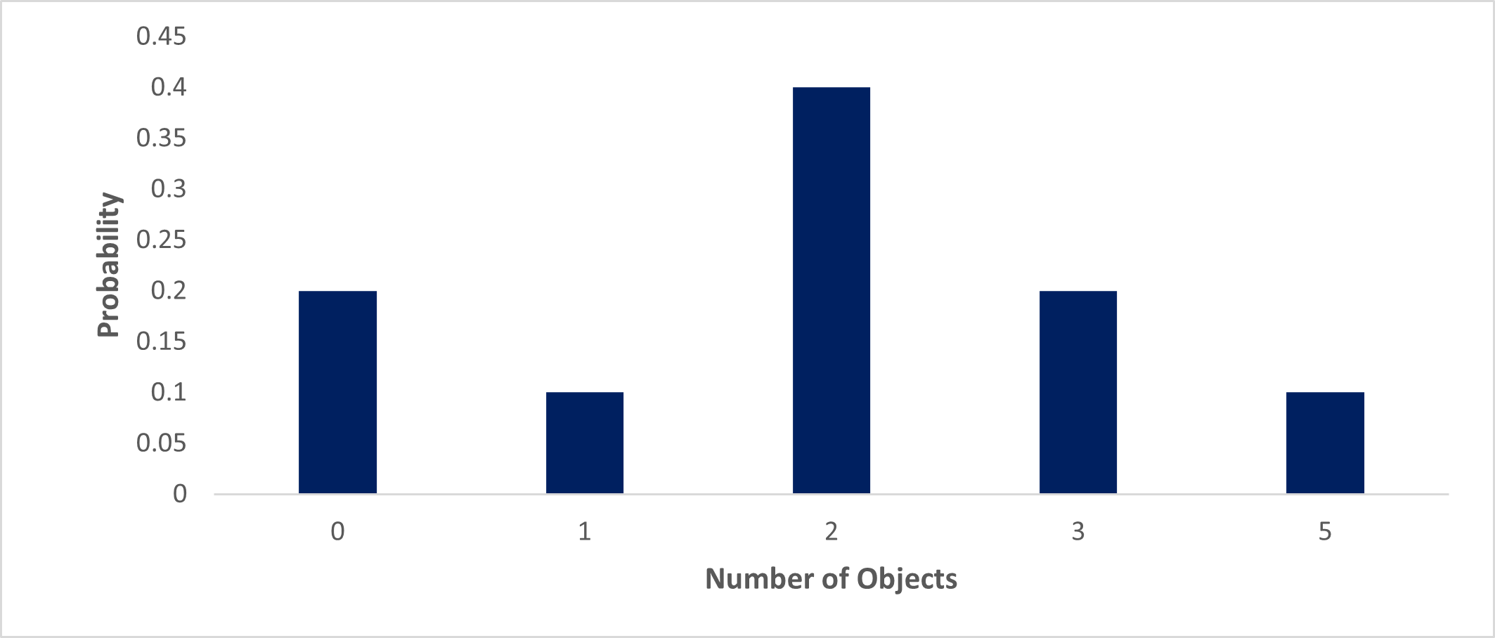 The model of when, where it appears, and how large the new object is would not be a deterministic model, as we don’t know in advance when and where objects will appear and how large they will be, but we can use data collected to describe those phenomena. We might observe twenty such objects appearing over a ten-year period. We could create a simple model that states that two objects appear per year. It might well be the case that in some years there were no objects appearing, and in some years there are more than two appearing, and therefore it is more appropriate to create a probabilistic model that allows for variability in the number of objects appearing per year. Suppose that the observed data is as follows. Over the ten-year period, there were two years with no objects observed, one year with one object, four years with two objects, two years with three objects, and one year with five objects. One simple probabilistic model based on the observed data is that in any particular year, there will be a 0.2 (two in ten years) probability of no objects appearing, a 0.1 probability of one object, and a 0.4 probability of two objects. 0.2 probability of three objects and 0.1 probability of five objects. This model simply reflects the observed data.