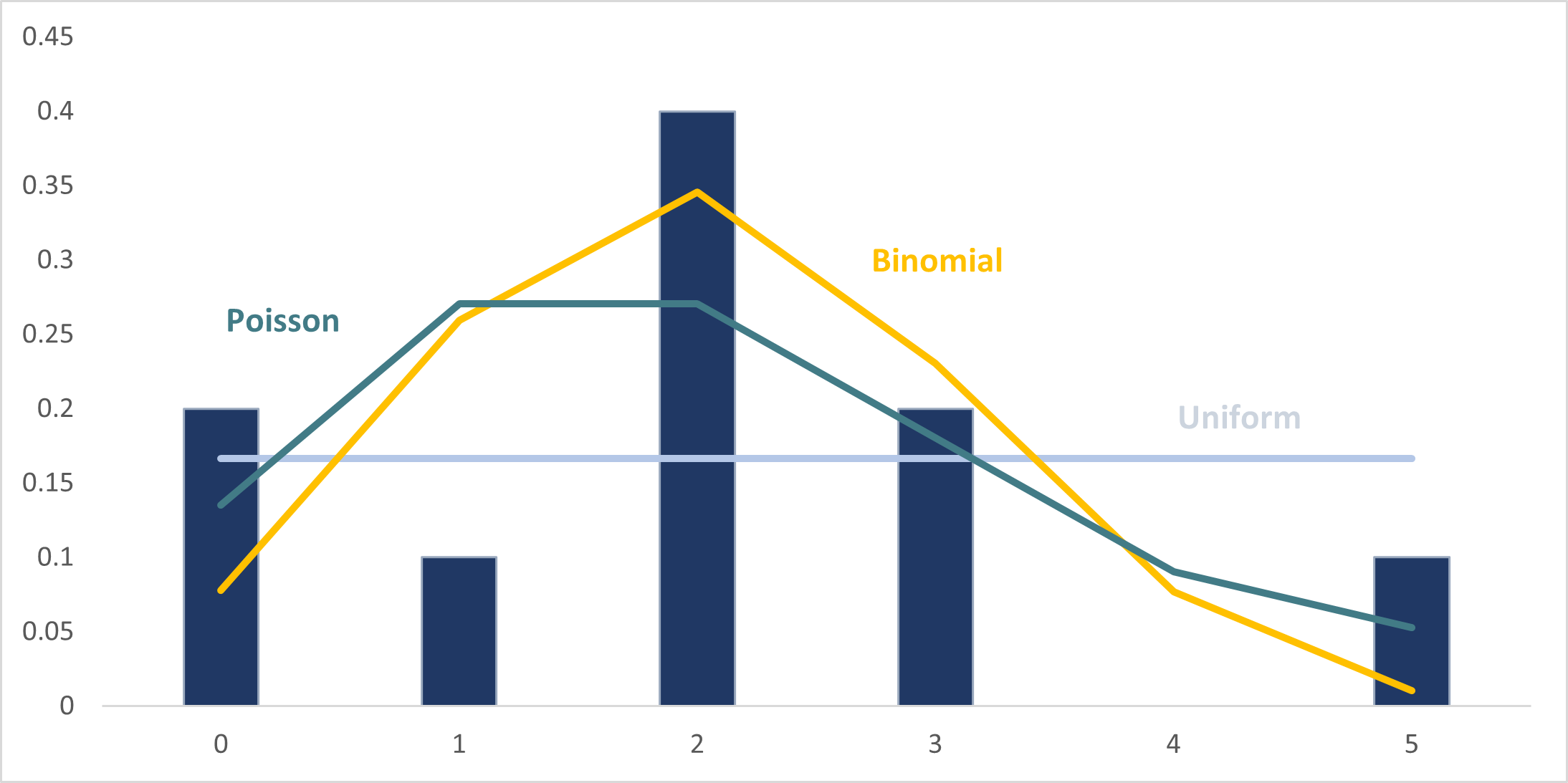 Readers familiar with some simple discrete integer valued probability distributions will know the uniform, binomial and Poisson distributions. It will be left to the reader to assess which of these probability distributions appears to be the best fit of the observed data.