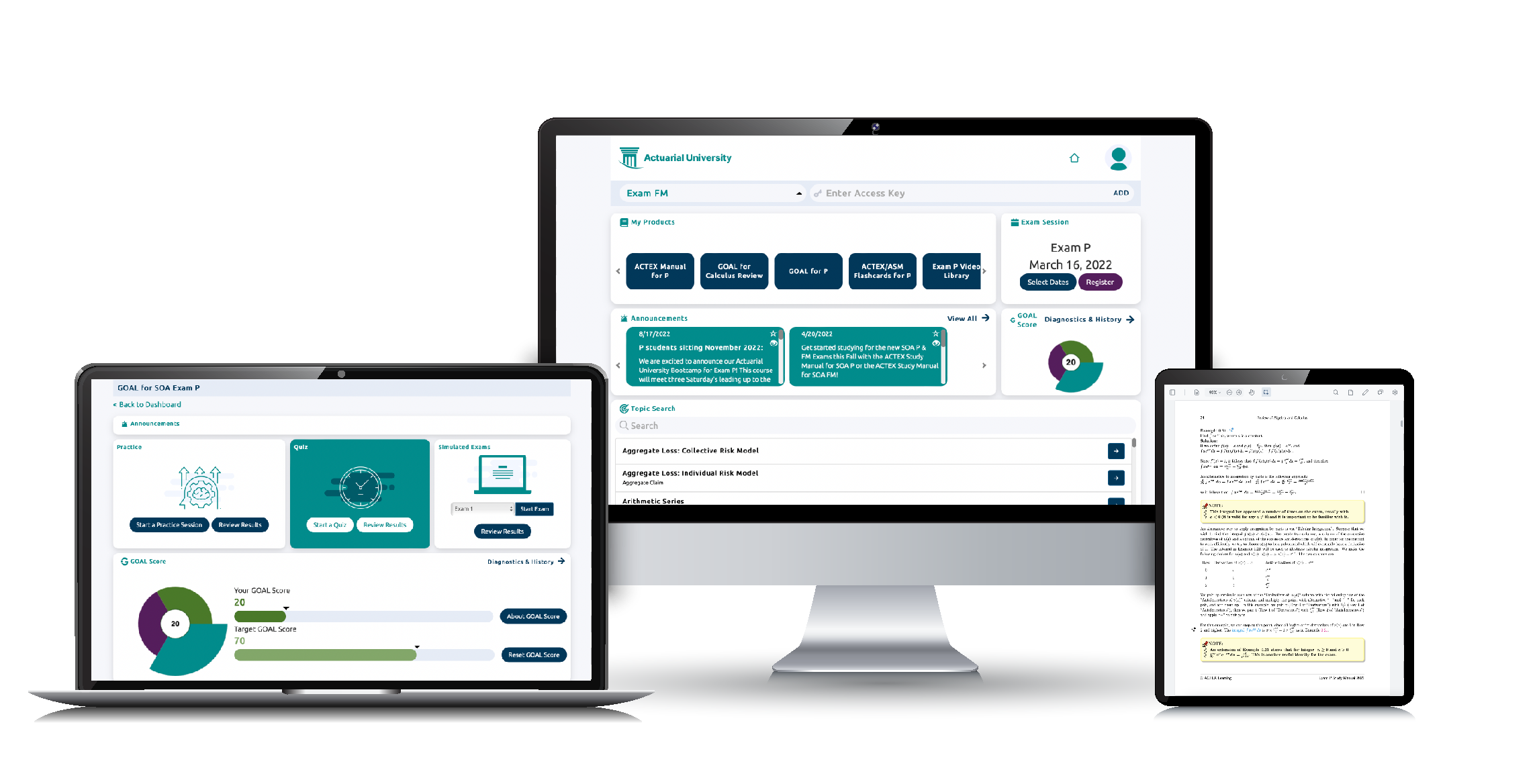 The ACTEX Exam CS1 Bundle offers a comprehensive collection of study materials tailored to help you succeed on the CS1 exam. This all-in-one package includes a detailed study manual, engaging video lessons, our interactive GOAL platform for practice, and flashcards for quick review. Together, these tools deliver a seamless learning experience that builds your confidence and prepares you for exam day.